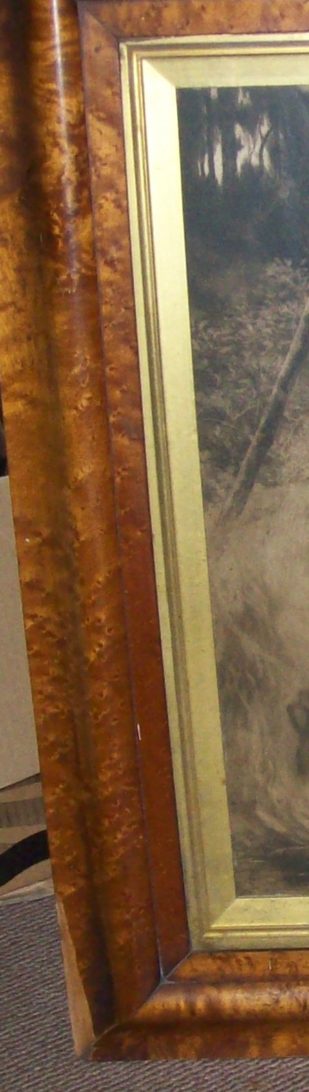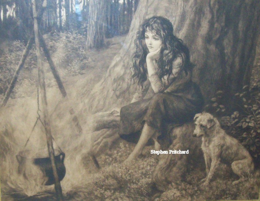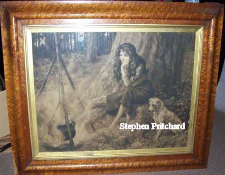 Herbert Dicksee original etching from 1903 The Little Gipsy painting of a seated gypsy girl with a seated Wire-haired Terrier by a cauldron in original wide Burrwood frame with gilt slip. Slight damage to lower left of frame (See illustration) but doesn’t detract from the beauty of the picture